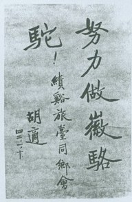 这件“努力做徽骆驼”墨宝,是胡适于1953年1月10日在台湾书赠“台北绩溪旅台同乡会”的即兴题词,意在告诉绩溪旅台同乡人,要发挥徽州人吃苦耐劳的“徽骆驼”精神,提醒旅台绩溪同乡人,不要忘记徽州绩溪的老家,直到1962年2月24日病逝前夕,胡适仍然坚持用绩溪方言读书吟诗,不忘“我是安徽徽州人”。台湾中华书局出版的《辞?!分卸浴盎章嫱铡钡氖鸵迨牵骸盎罩莶徊嫱?,此乃喻徽州人正义奋斗、宁死不屈之性格。据史料记载:明末清初,金声抗清被俘于绩溪丛山关,他密令部属退守皖、浙边界的荆州山区,利用地形,封锁四岭,不降异族,要做徽骆驼,意为不畏艰难,不怕牺牲,任劳任怨,跋涉不止的精神,徽骆驼之名由此不胫而走。”人们说:其实胡适就是一头学海跋涉的“徽骆驼”,正是徽骆驼精神和现代文明的融合,才造就了“集35个博士头衔于一身”的胡适传奇。