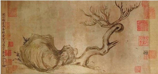 枯是荣的极大反差、强烈对比。故在山水画幅里的杂树中,准间有一二枯枝枯干,枯藤之上,几点寒鸦,枯松躯干,乱苔寄生。诗文里,留得枯荷听雨声,菊暗荷枯一夜霜?;缰凶ㄓ斜硐挚莞傻母呤郑彼紊蚶ū阌小翱菽竟刭谧钅驯取钡乃捣?,苏东坡更绘有《枯木竹石图》。东坡此图画的是一块巨石压着一颗干枯的弯树,石下生出几丛嫩竹,北宋画家米芾《画史》说他“子瞻作枯木,枝干虬屈无端。石皴硬,亦怪怪奇奇无端,如其胸中盘郁也”,故将枯木竹石画得诡谲不经、奇形怪状。