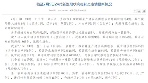 国家卫健委:7月5日新增确诊病例4例 其中本土病例1例在北京