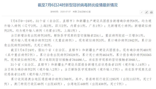 人民网北京7月7日电(董童)国家卫生健康委于今日在官网公布的《截至7月6日24时新型冠状病毒肺炎疫情最新情况》(以下简称“情况”)称,7月6日0—24时,31个?。ㄗ灾吻?、直辖市)和新疆生产建设兵团报告新增确诊病例8例,均为境外输入病例(辽宁2例,上海2例,四川2例,内蒙古1例,广东1例);无新增死亡病例;新增疑似病例2例,均为境外输入病例(内蒙古1例,上海1例)。当日新增治愈出院病例10例,解除医学观察的密切接触者254人,重症病例较前一日增加1例。