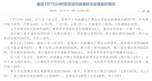 国家卫健委:7月7日新增确诊病例7例
