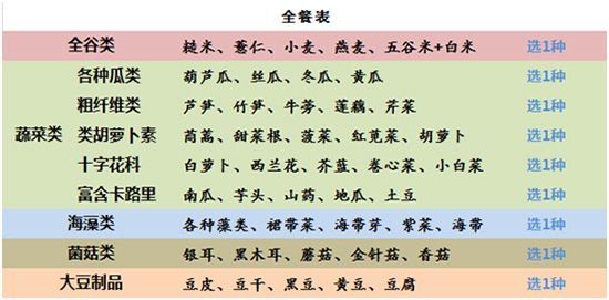 PS:除了全餐菜单以外,注意足量饮水、适量运动,以及每天1-2份生机蔬果。