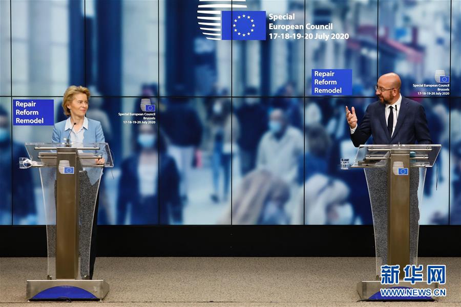 7月21日,在比利时布鲁塞尔的欧盟总部,欧洲理事会主席米歇尔(右)和欧盟委员会主席冯德莱恩在欧盟峰会后出席记者会。新华社发(欧盟供图)