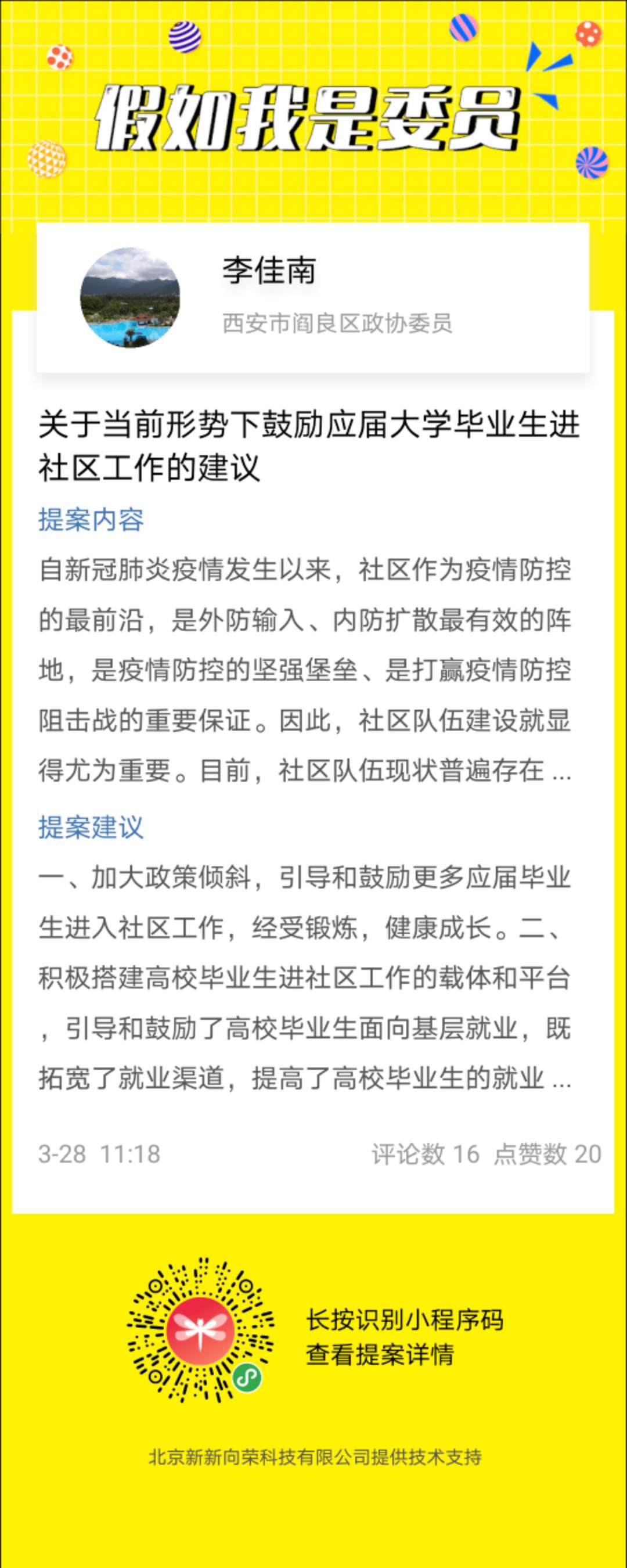 李佳南委员曾在假如我是委员平台发表提案《关于当前形势下鼓励应届大学毕业生进社区工作的建议》,呼吁大学毕业生进社群参与社区服务工作,这件提案李委员当时是处于什么样的原因有感而发的呢?