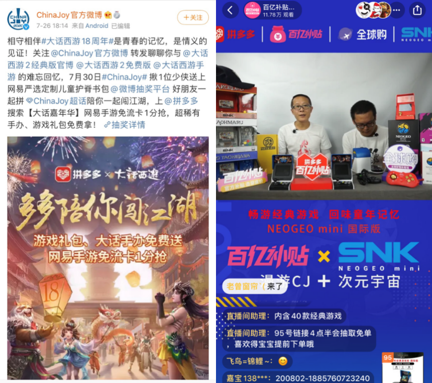 日本游戏开发公司巨头SNK已授权其代理商入驻拼多多,SNK拥有拳皇系列、侍魂系列、合金弹头系列等知名游戏IP。同时,街机联网对战平台“约战竞技场”也开通了拼多多入口,直达拼多多百亿补贴电玩商品。同时国内知名游戏公司网易游戏旗下国风经典IP“大话西游”适逢18周年之际,也与拼多多联手宣发电商独家合作。