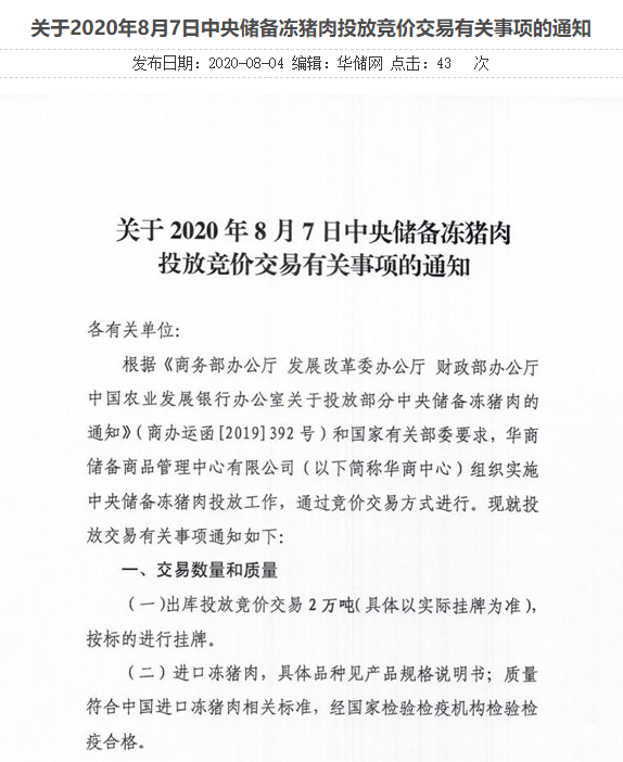 中新经纬客户端8月4日电 华储网4日发布通知,华商储备商品管理中心有限公司组织实施中央储备冻猪肉投放工作,将于8月7日出库投放竞价交易2万吨。