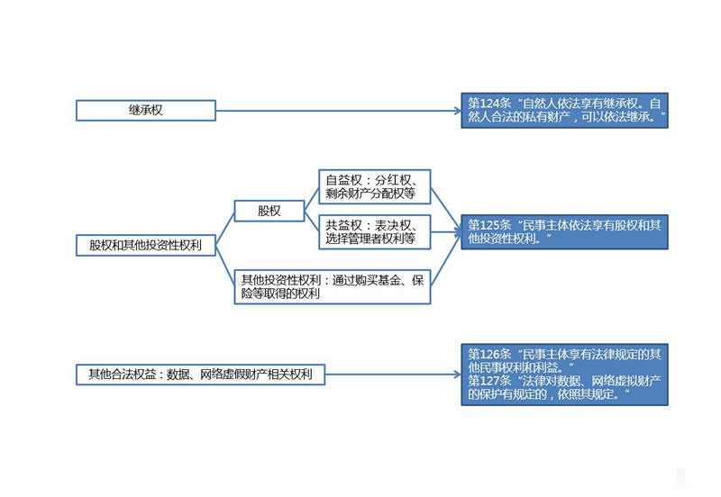 在第五章总计24个条款的规定中,民法典明确了民事主体拥有的人身权、物权、债权、知识产权、继承权、股权和其他投资性权利、其他合法权益等七大类民事权利。
