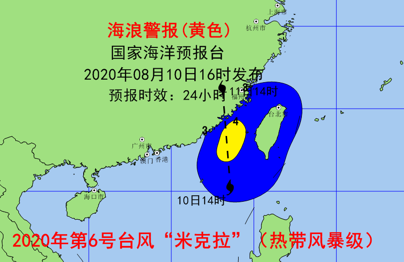 海浪方面,受今年第6号台风“米克拉”(热带风暴级)的影响,预计8月10日夜间到11日中午,南海东北部、台湾海峡将出现3到5米的大浪到巨浪区,福建中南部近岸海域将出现2.5到3.5米的大浪,海浪预警级别为黄色。