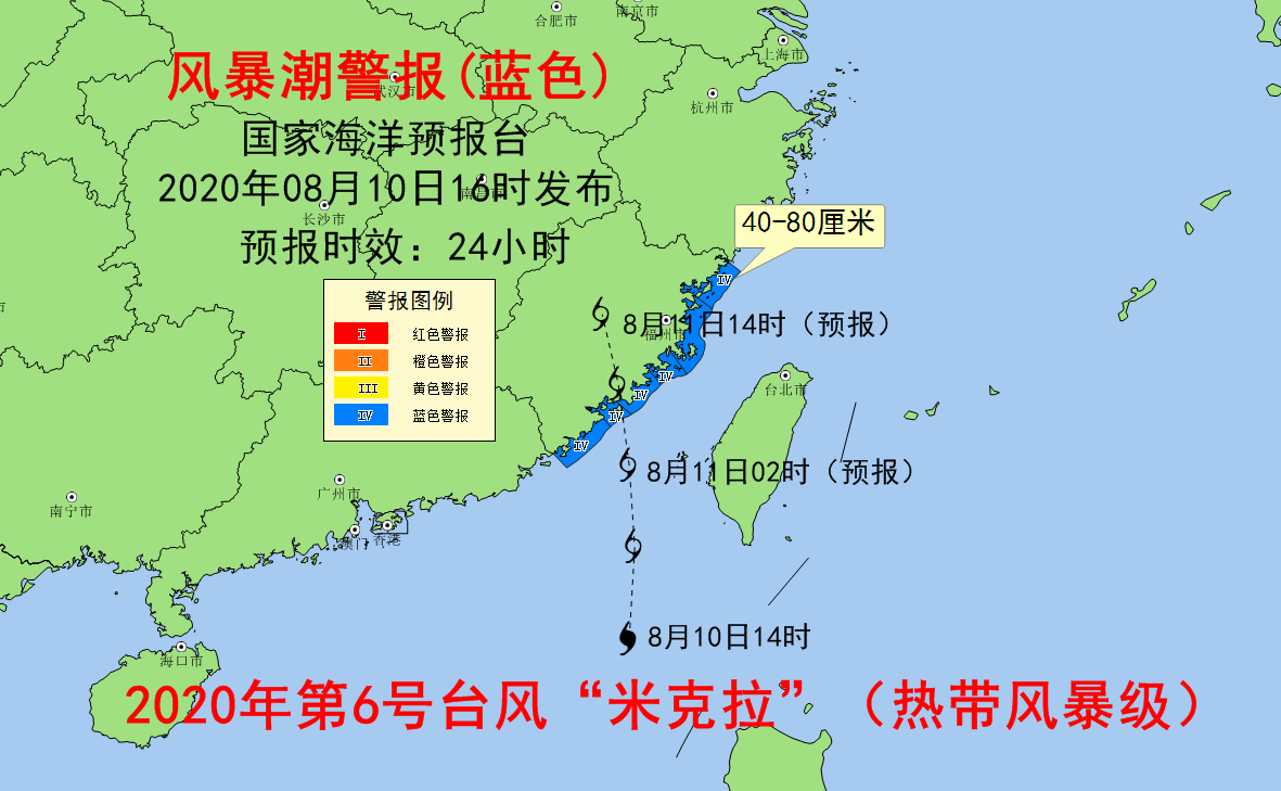 风暴潮方面,受台风“米克拉”的影响,预计8月10日傍晚至11日中午,福建沿海将出现40到80厘米的风暴增水,上述岸段内的风暴潮预警级别为蓝色。