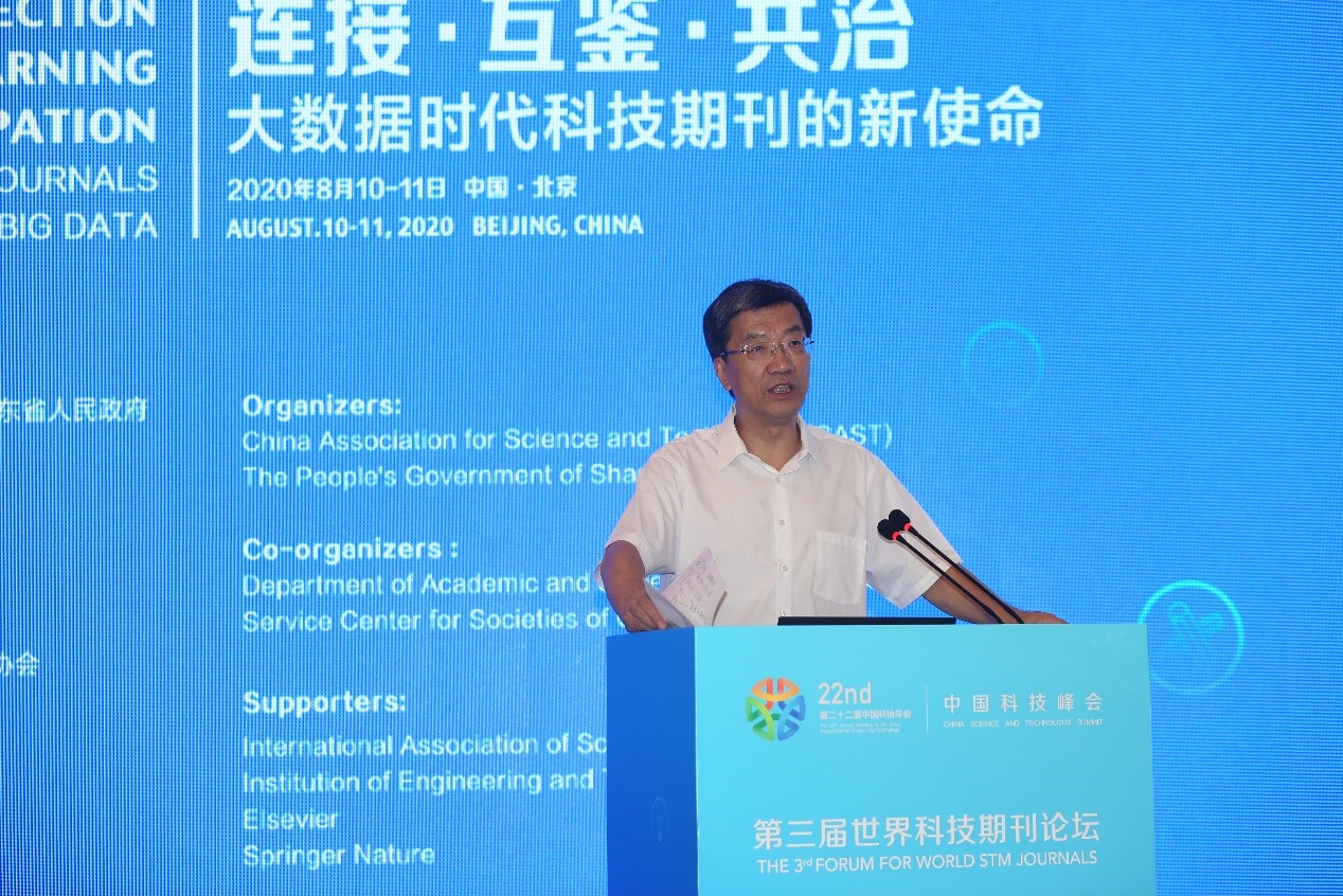 人民政协网北京8月11日电 第二十二届中国科协年会重点活动“中国科技峰会—第三届世界科技期刊论坛”主旨报告会10日在北京举行。本届论坛以“连接?互鉴?共治——大数据时代科技期刊的新使命”为主题,围绕开放科学和出版传播前沿热点问题,探讨科技期刊创新发展之路。中国科协党组书记、常务副主席、书记处第一书记怀进鹏院士出席论坛并致辞。浙江大学教授、原校长、国家自然科学基金会原主任杨卫院士,科技部原副部长、《光:科学与应用》主编曹健林研究员,中国科学院学部主席团成员、全国政协常委饶子和院士,中国科协党组成员、书记处书记吕昭平出席论坛。