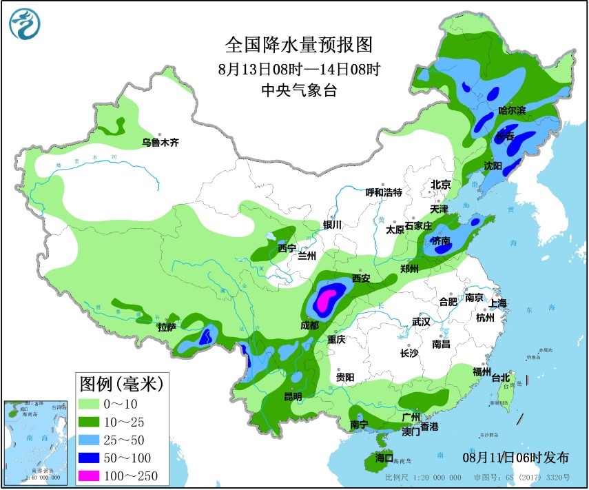 13日,强降雨主要出现在东北地区,内蒙古东北部、黑龙江、吉林、辽宁、山东、陕西西南部、甘肃东南部等地有中到大雨,局地暴雨。