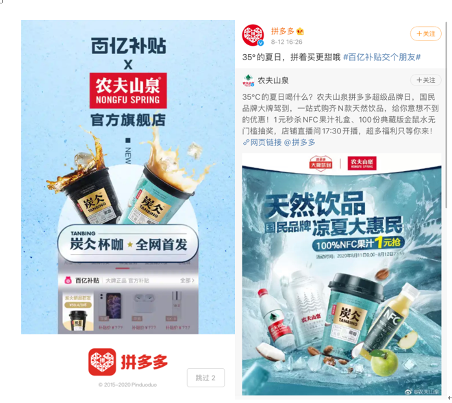 8月11日,农夫山泉官方旗舰店在拼多多正式上线,双方联合推出了新品首发、1元秒杀等多项活动。