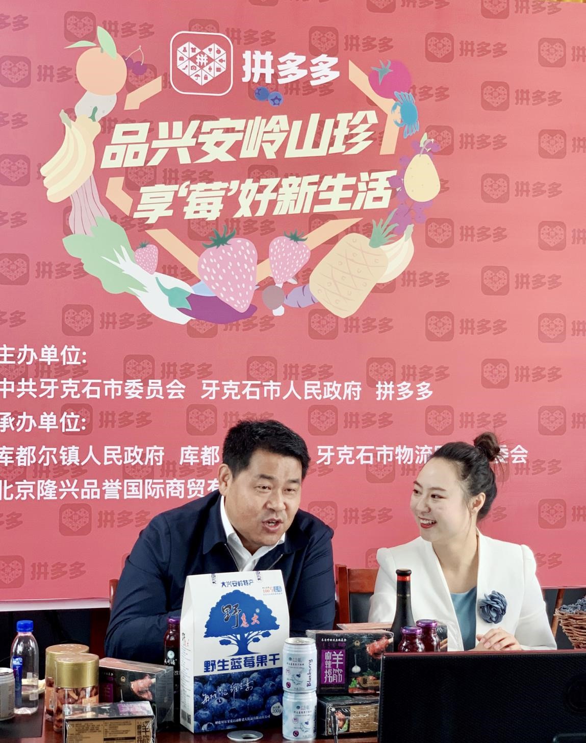 8月14日,内蒙古自治区牙克石市委副书记、市长臧著强,库都尔林业局党委书记董晓斌走进拼多多直播间,为当地的野生蓝莓、沙棘等深加工产品“代言”。
