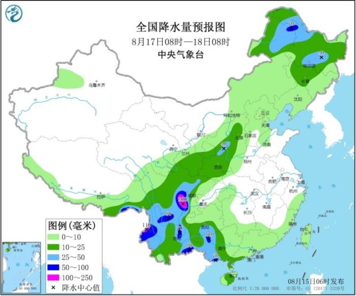 图5 全国降水量预报图(8月17日08时-18日08时)