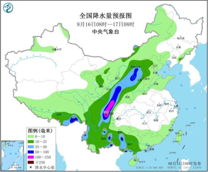 8月15日08时至16日08时,四川盆地西部和南部、甘肃东南部、陕西中部和西南部、山西南部、河北东部和南部、辽东半岛、山东北部、云南西北部和南部、广西南部沿海、广东西南部沿海、海南岛南部、西藏东南部等地部分地区有大到暴雨,其中,四川盆地西北部等地局地有大暴雨(100~200毫米)(见图3)。