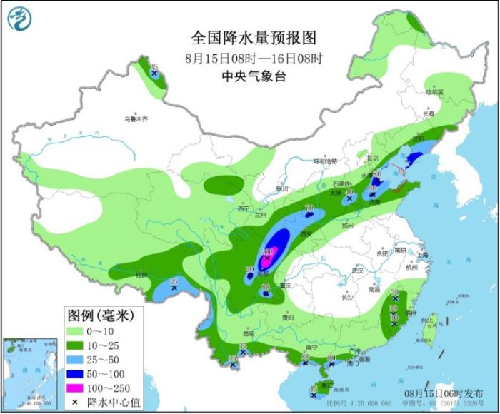 预计,8月15日08时至16日08时,四川盆地西部和南部、甘肃东南部、陕西中部和西南部、山西南部、河北东部和南部、辽东半岛、山东北部、云南西北部和南部、广西南部沿海、广东西南部沿海、海南岛南部、西藏东南部等地部分地区有大到暴雨,其中,四川盆地西北部等地局地有大暴雨(100~200毫米)。上述部分地区伴有短时强降水(最大小时降雨量30~60毫米,局地可超过80毫米),局地有雷暴大风等强对流天气(见图1)。中央气象台8月15日06时发布暴雨黄色预警。