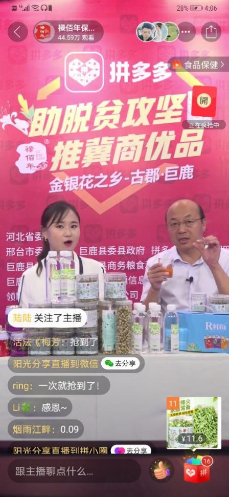 8月14日,河北巨鹿县副县长付玉林做客拼多多直播间,为网友推介当地金银花系列产品,吸引近50万网友围观。