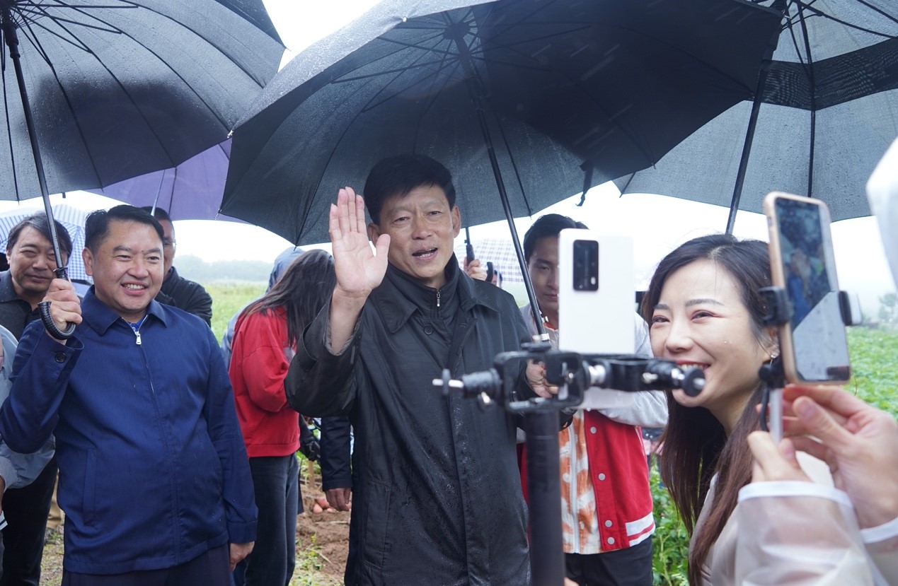昭通市委书记杨亚林(中)冒雨在土豆田向网友推介“昭通大洋芋”(谢鸿伟/摄)