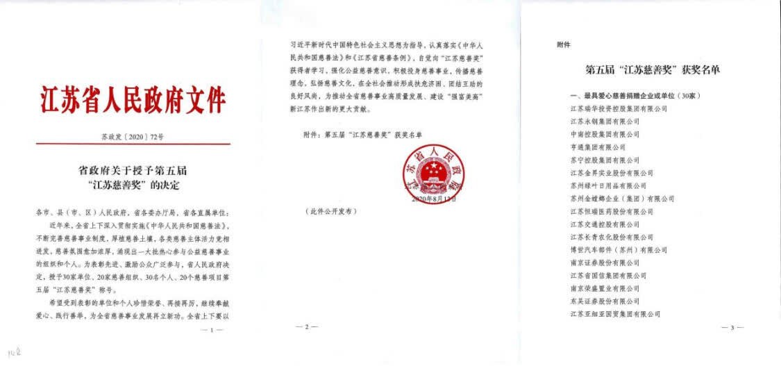 日前,第五届“江苏慈善奖”名单揭晓,苏州绿叶日用品有限公司荣获“最具爱心慈善捐赠企业或单位”称号。