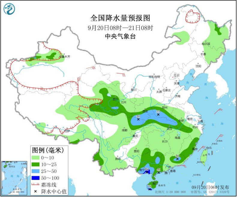 9月20日08时至21日08时,华南中西部等地的部分地区有中到大雨,广西南部沿海、海南南部局地暴雨(50~80毫米);新疆沿天山地区西部、青藏高原中东部、西北地区东部和南部、青海中东部、四川盆地、黄淮西部、江汉、江淮西部、江南以及东北地区中北部等地有小到中雨,其中,陕西南部、四川东部、湖北北部、河南南部等地部分地区有大雨。新疆东部和南部、内蒙古中西部、甘肃西部、青海西部等地的部分地区有4~6级风。(见图1)。东海大部海域、台湾海峡将有6~7级、阵风8级的东北风,其中东海东南部部分海域的风力可达8级、阵风9级。