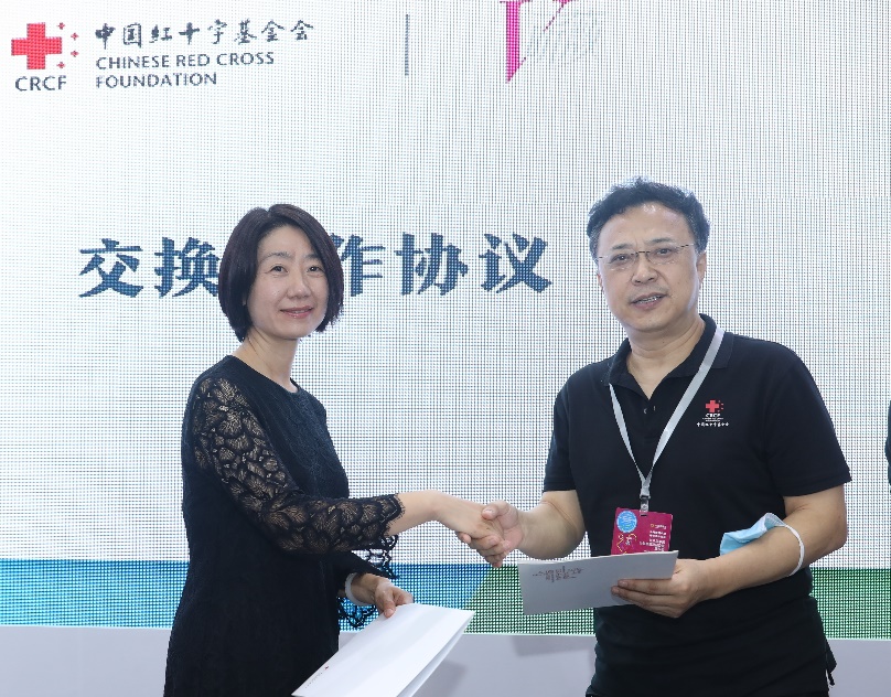 郭长江、李菁分别代表中国红十字基金会和昕薇杂志交换合作协议