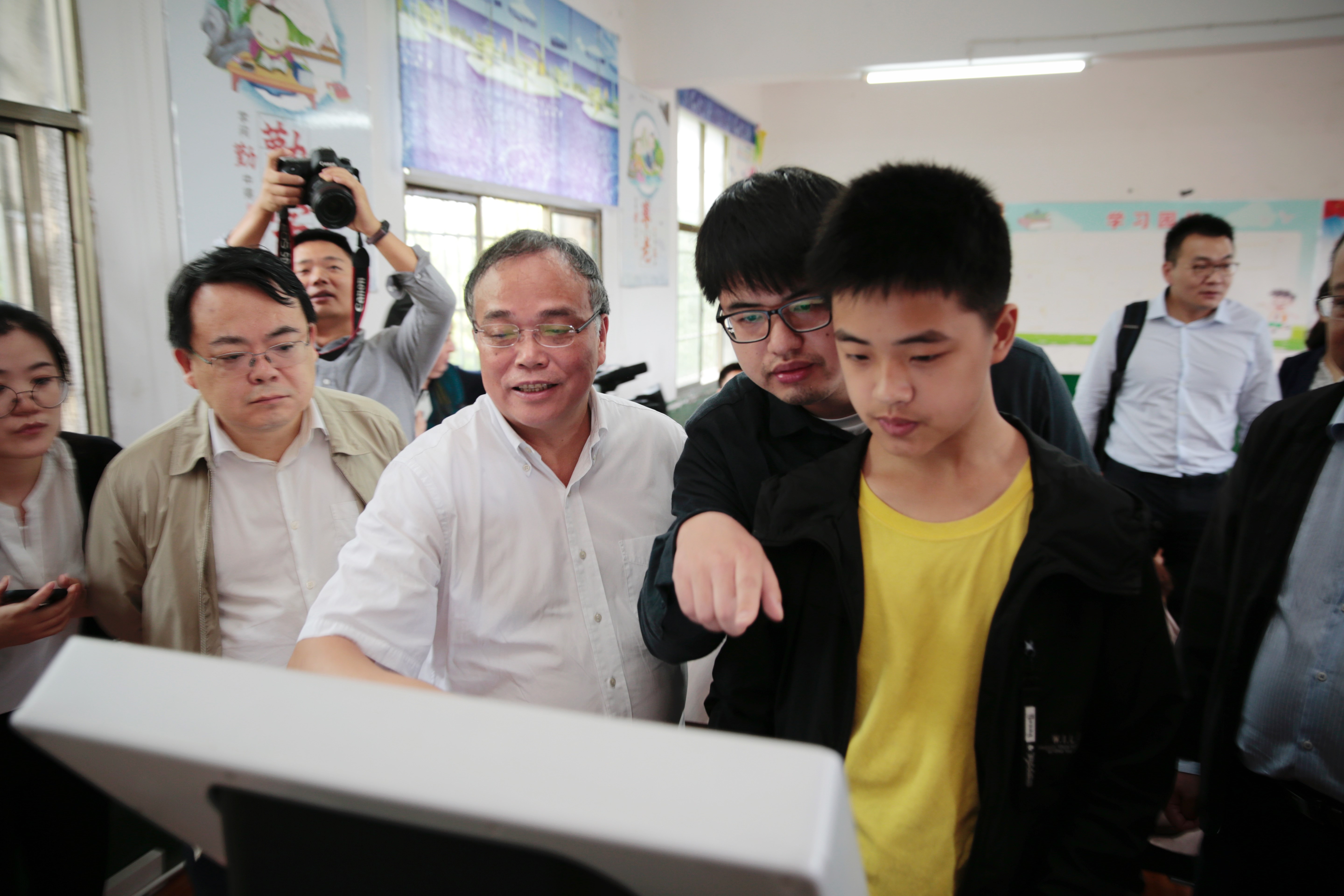 湖南省政协副主席张灼华(右三)观看学生使用有道智能学习终端