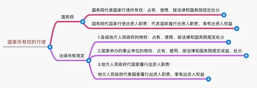 国家所有权由国务院代表国家行使,法律另有规定的,也可以由地方各级人民政府等部门行使国家所有权的有关权利。除民法典外,我国还有许多涉及自然资源的法律对此都有相应规定,如土地管理法、矿产资源法、渔业法、森林法、草原法等。企业国有资产法第11条对中央和地方政府分别代表国家履行出资人职责做出规定,同时明确了对国有资产监督机构等的授权。