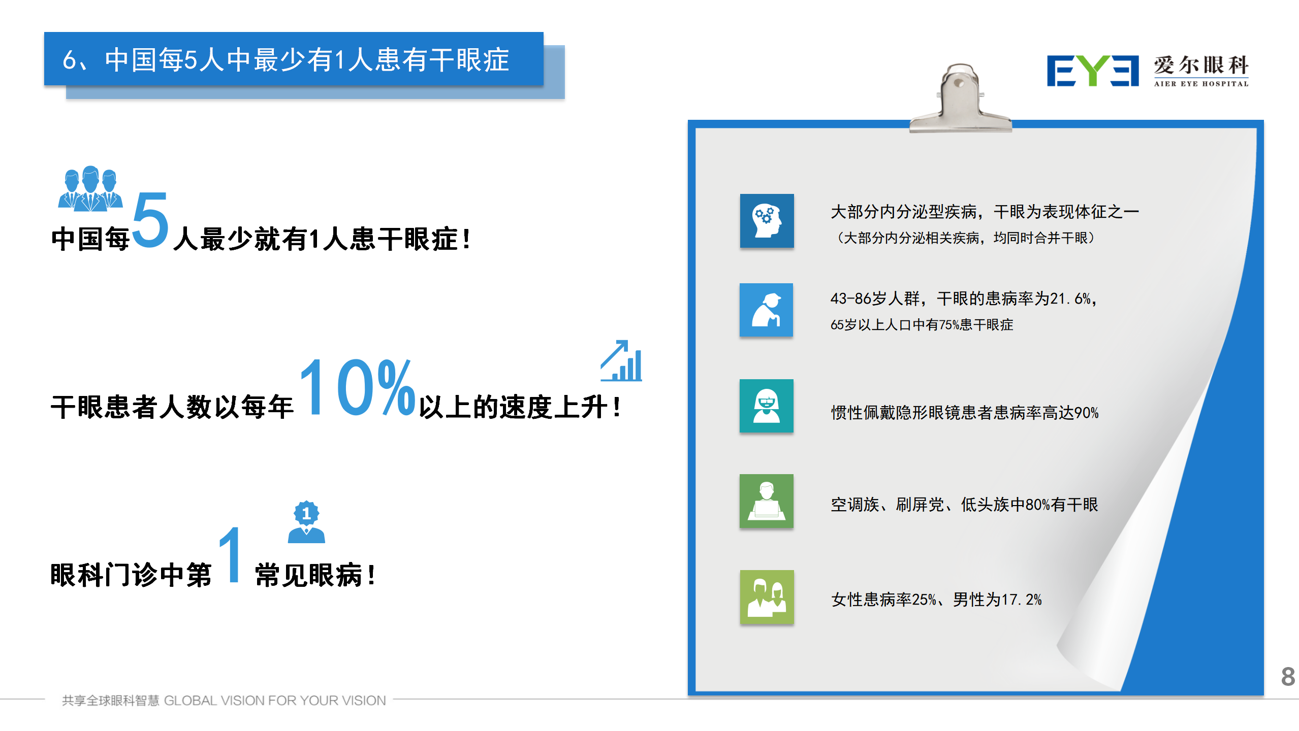 据2013年干眼临床诊疗专家共识指出,干眼在我国的发病率约为21%-30%,医疗机构门诊就诊的干眼患者占眼科总就诊人数的30%以上,干眼可谓无处不在,覆盖全年龄段人群。