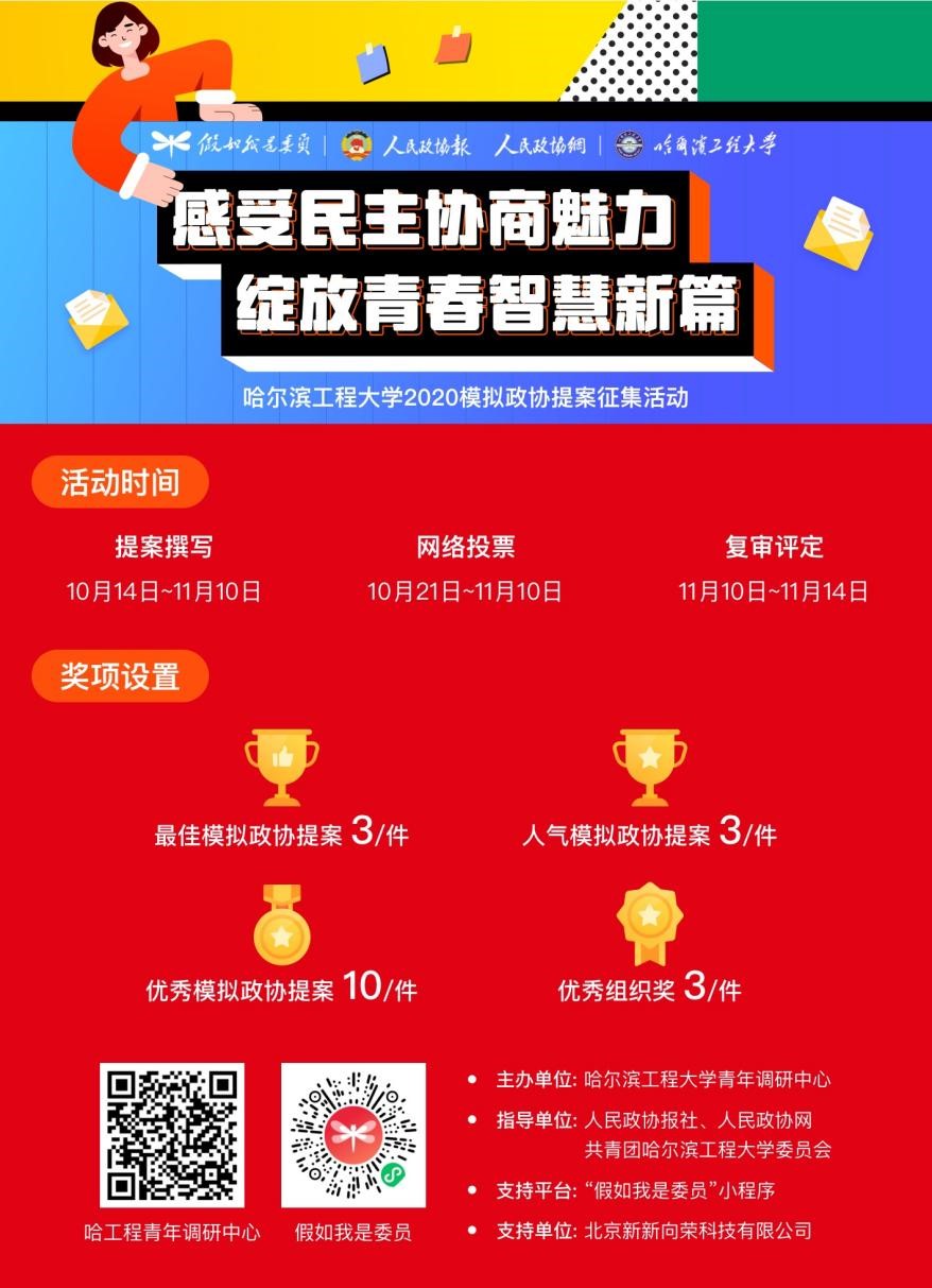 为更好发挥哈尔滨工程大学共青团作为党联系青年的桥梁纽带作用,引导广大同学了解并有序参与国家政治生活,在亲身实践中体验中国特色社会主义制度优势、增强制度自信,哈尔滨工程大学校青年调研中心联合人民政协报社、人民政协网和“假如我是委员”平台开展2020年模拟政协提案征集活动“感受民主协商魅力,绽放青春智慧新篇”。