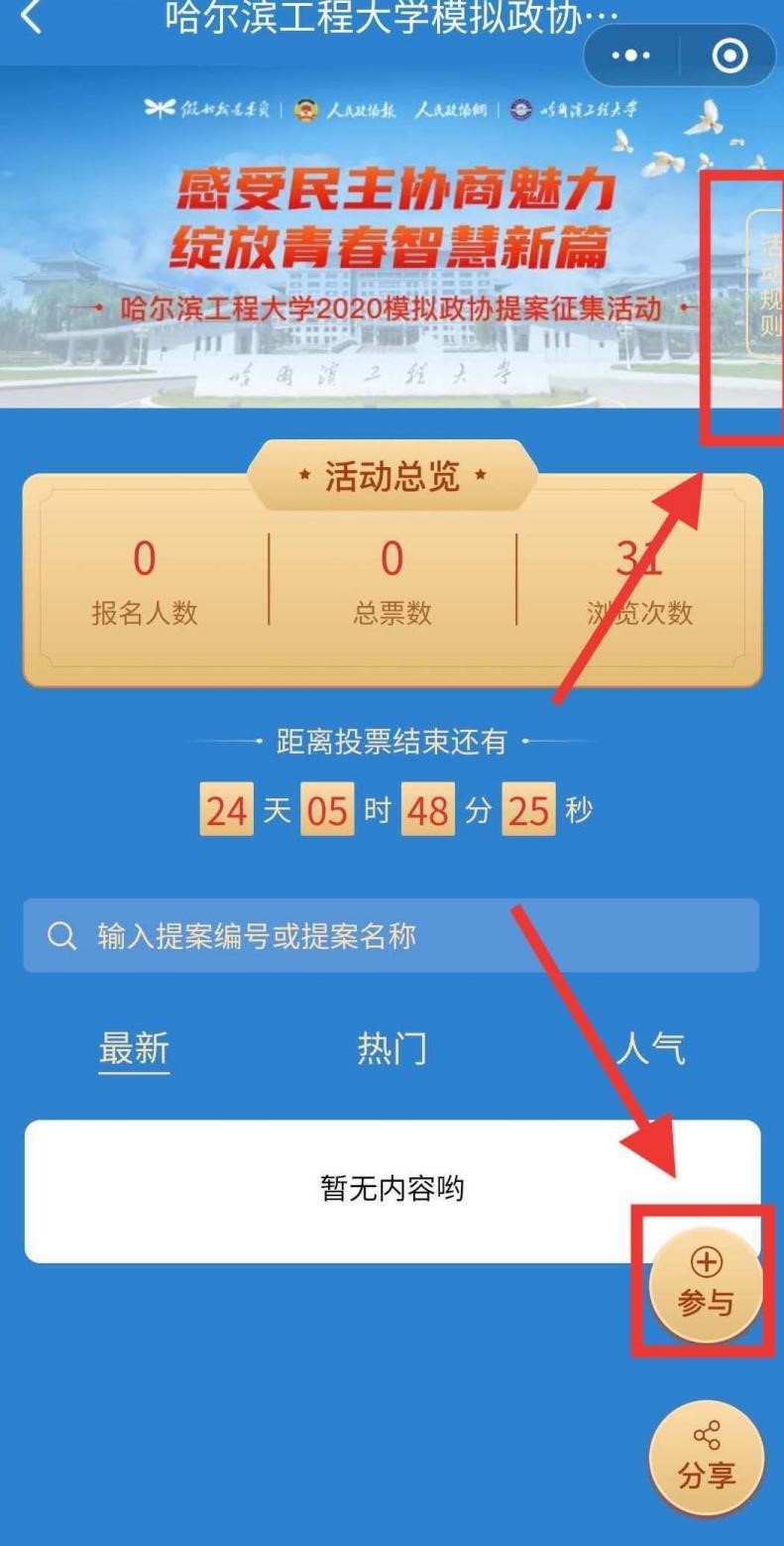 第二步,点击活动进入“感受民主协商魅力,绽放青春智慧新篇”活动页。也可点击下方链接进入活动页哦! 点击活动页右侧“参与”按钮提案下方署名学院班级姓名。点击“活动规则”即可详细阅读。