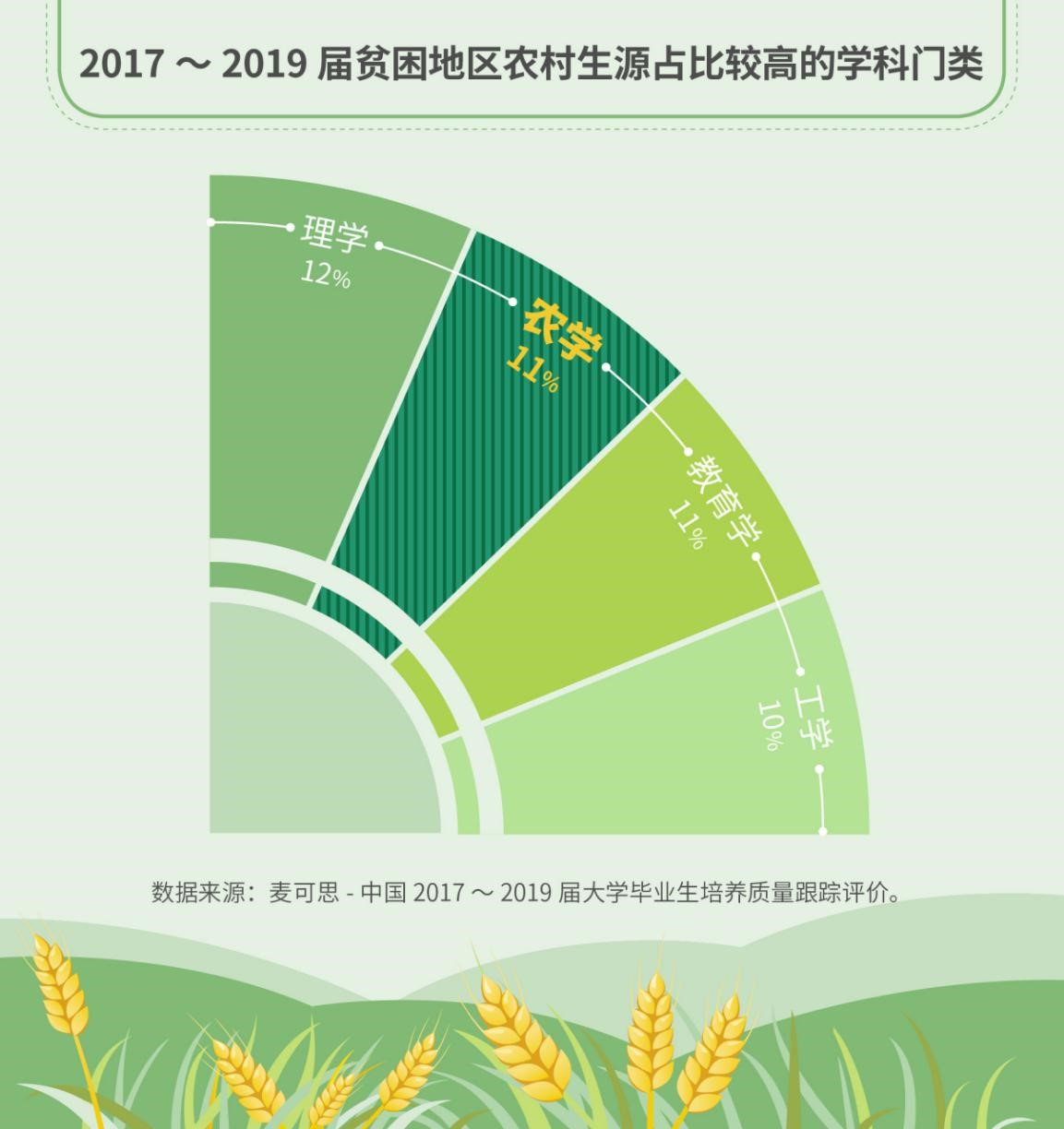 麦可思数据显示,2019届农学本科毕业生中,农村生源占比50%。并且贫困地区农村生源 学农比例相对较高,2017~2019届贫困地区农村生源里有11%的人学农,该比例仅低于理学门类本科生(12%)。