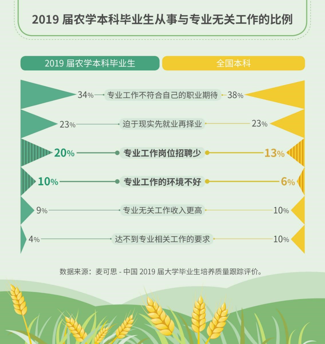 对于2019届农学本科毕业生学农不务农的原因,数据显示,“专业工作不符合自己的职业期待”(34%)是最主要因素。同时需注意的是,从事与专业无关工作的2019届农学本科毕业生,因“专业工作岗位招聘少”(20%)和“专业工作的环境不好”(10%)的比例,均明显高于全国本科平均水平。