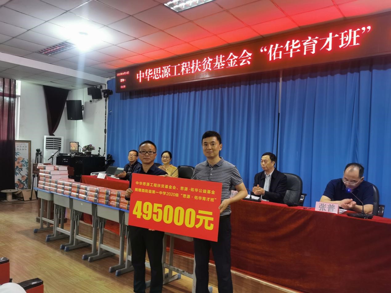 开班仪式上,刘伟代表民建重庆市委会为初2020级“思源?佑华教育移民班”、高2020级“思源?佑华育才班”揭牌,并代表中华思源工程扶贫基金会、思源?佑华公益基金向各地受助学校捐赠项目资金共139.5万元,还向同学们赠送了价值2万元的课外辅导书籍。