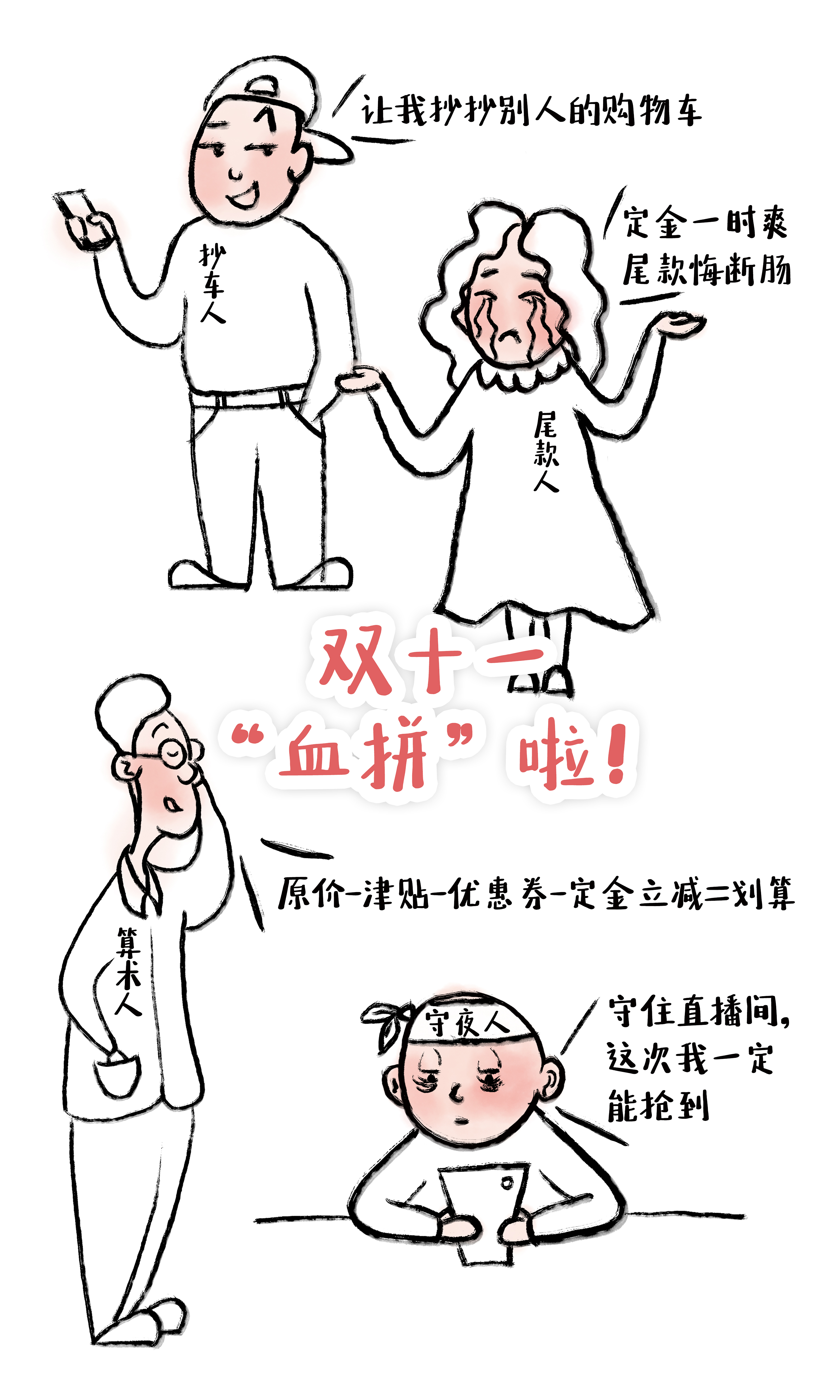 算术人:与“抄车人”不同,他们更愿意计算优惠,货比三家,在“双十一”一年比一年复杂的计算规则中寻找最优惠的商品,定金膨胀、买五退一、跨店减免、套餐赠品……混合在一起,被人们调侃为堪比微积分的计算,难不倒“算术人”,最终得出的结果往往是A商品每毫升比B商品便宜2毛钱。