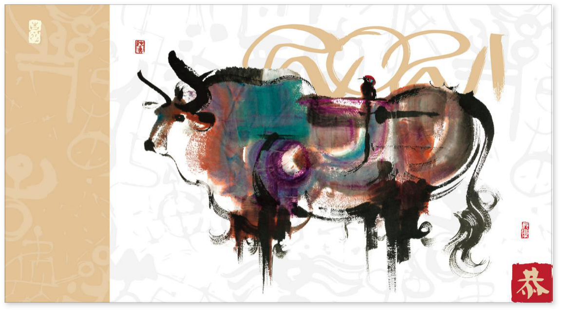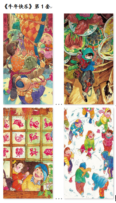 祝??ā杜D耆缫狻贰缎麓核透!?,画面以健硕而充满活力的牛为主要形象,传递国裕民康的良好祝愿,分别由南开大学东方艺术系副教授张旺、中国工艺美术协会会员武世宁设计。