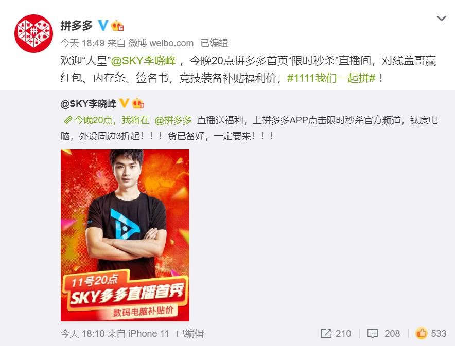 中国电竞第一人SKY拼多多直播首秀:超20万网友拼购数码产品,2小时销售额破300万
