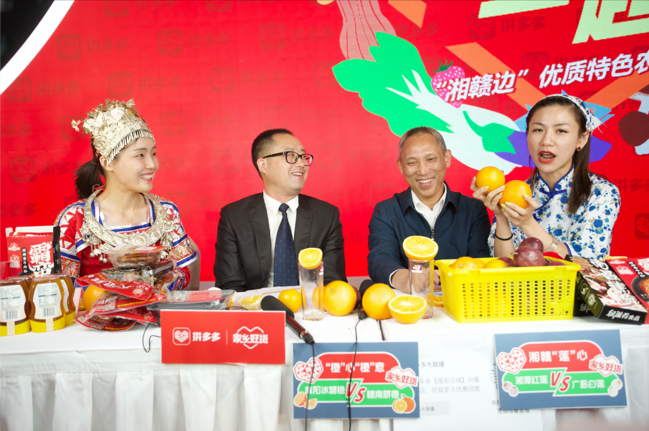 直播期间,江西省农业农村厅一级巡视员万国根与湖南省农业农村厅市场与信息化处处长张志刚还一同走进拼多多直播间,为麻阳冰糖橙、赣南脐橙、湖南米粉、江西拌粉等两地特色产品“加油助威”。