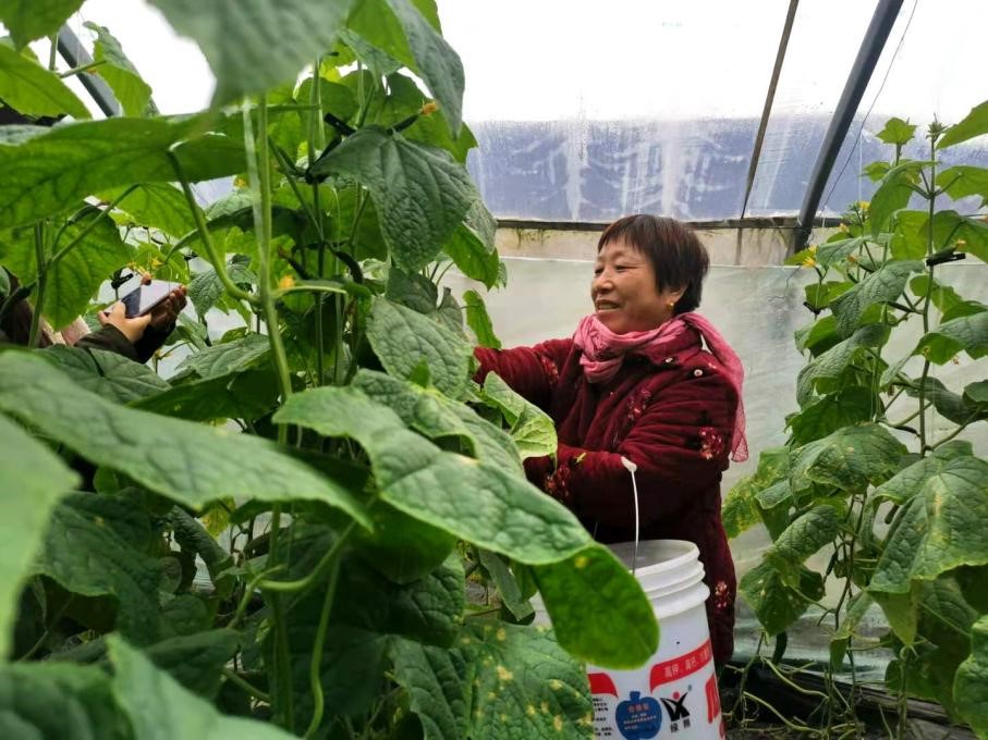 刘美莲在上蔡县状元红现代农业产业融合示范园内照料大棚里的水果黄瓜上。人民政协网记者付振强 摄