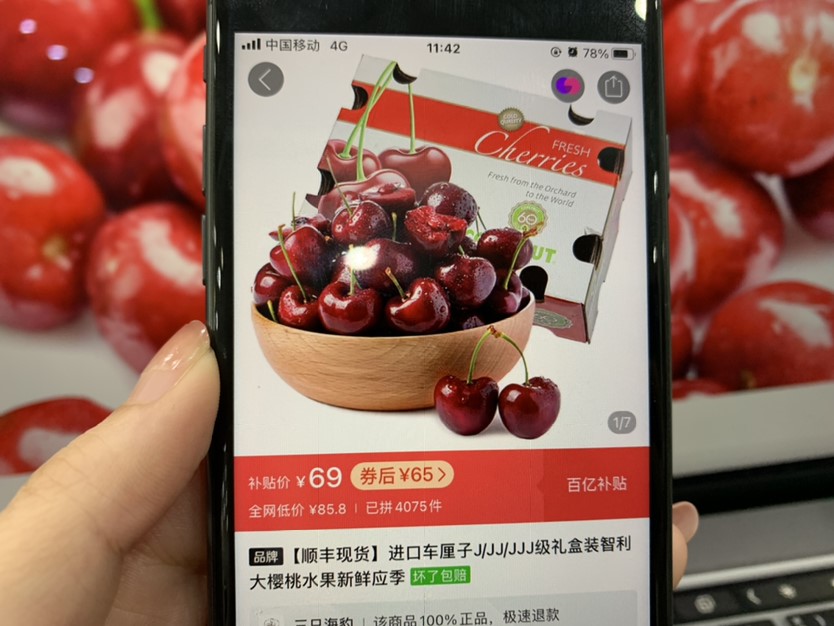 ▲智利进口车厘子享受拼多多“百亿补贴”,叠加优惠券后每斤到手价65元,大幅低于其他渠道售价。(杨玉鑫 摄)