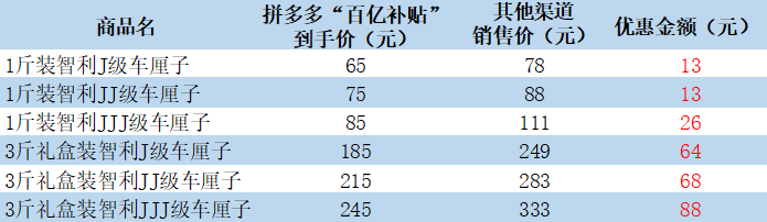 ▲拼多多“百亿补贴”智利车厘子65元起售,价格均低于其他渠道。其中,3斤礼盒装智利JJJ级车厘子比其他渠道便宜88元,优惠幅度高达26%。