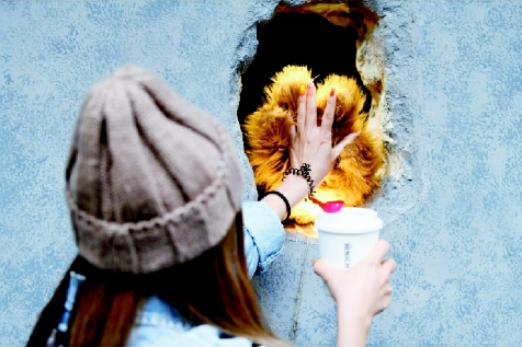 可在12月3日这一天,人们却站在墙上那个不甚规则的小小“山洞”前排起长队,等待扫码点单后,一只毛茸茸的“熊爪”从洞里递出咖啡。