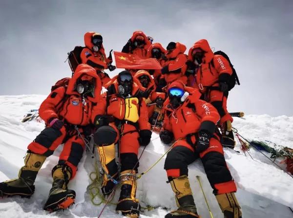 2020珠峰高程测量登山队在峰顶合影留念。新华社特约记者扎西次仁摄