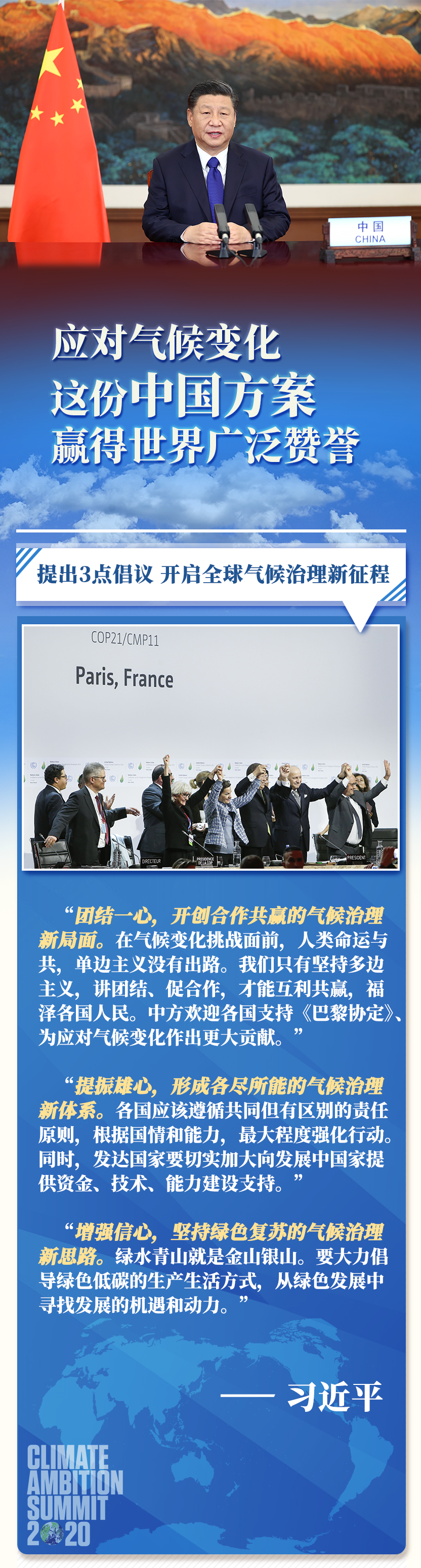 海外各界人士表示,习主席的重要讲话为全球气候治理提振雄心并提供新思路,彰显中国与世界各国携手助力《巴黎协定》行稳致远的决心,展现了中国重信守诺、为全球应对气候变化作出更大贡献的大国担当。
