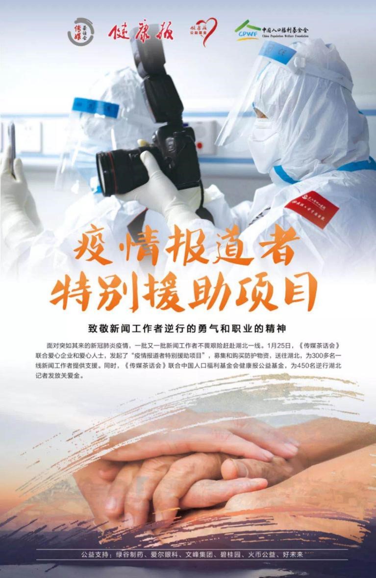 2020年1月25日(大年初一),《传媒茶话会》、中国人口福利基金会健康报公益基金,联合爱心企业、爱心人士等,发起了“疫情报道者特别援助项目”。该项目共筹集善款2764000元,前期用于为300多名一线记者购买防疫物资,后期剩余款项为450名“逆行”湖北的新闻工作者,按照每人每天100元的标准发放关爱金。