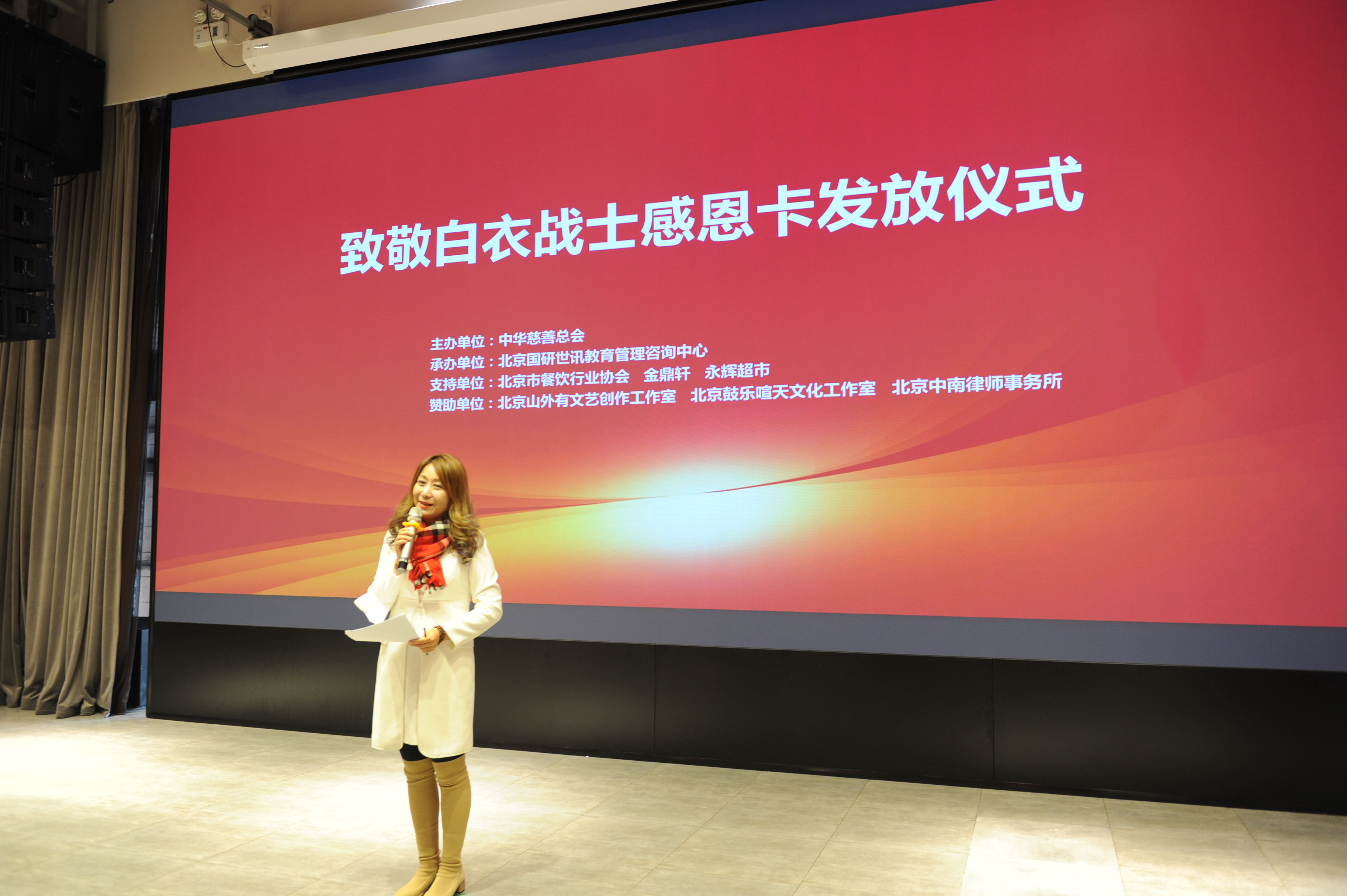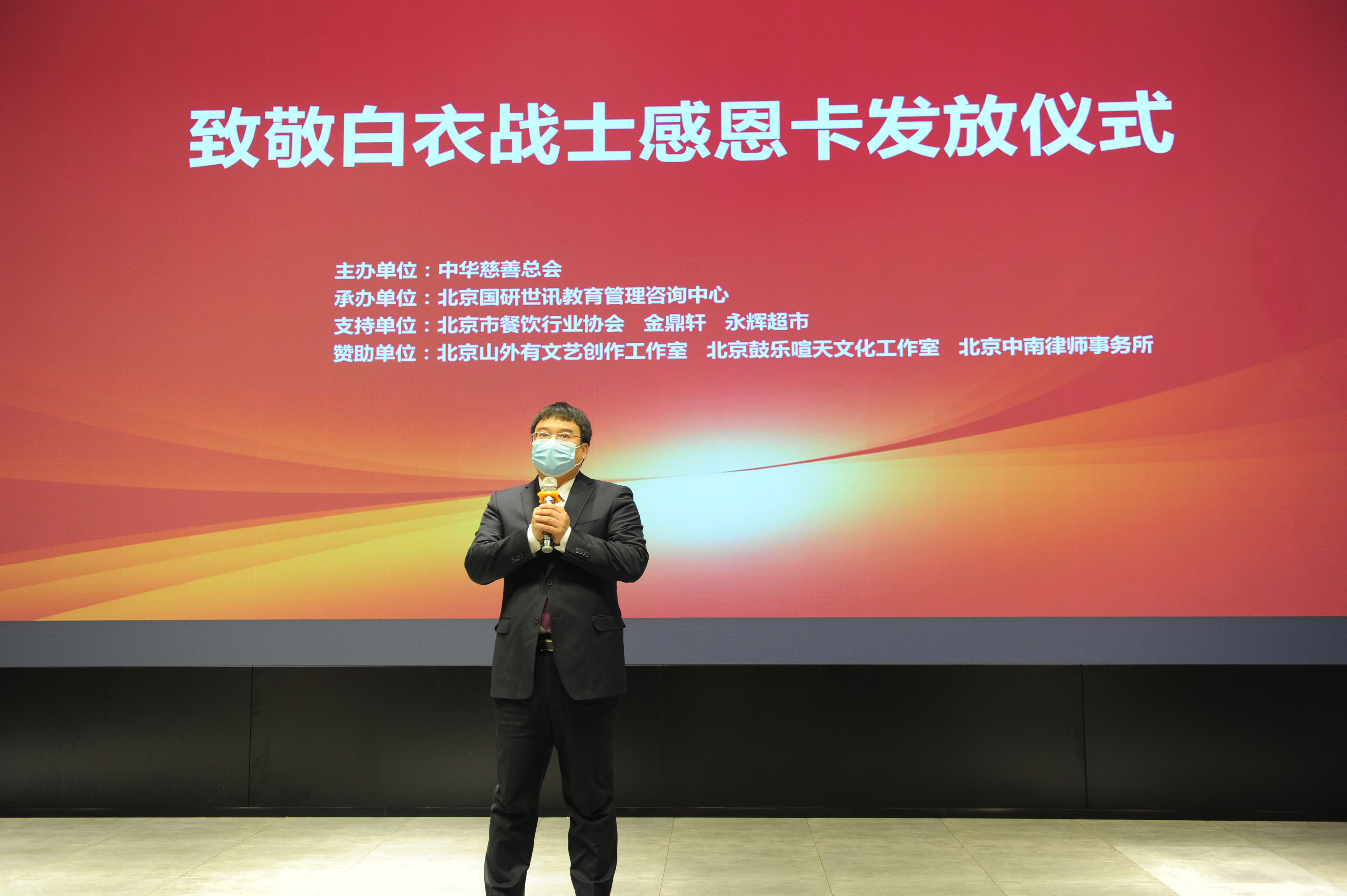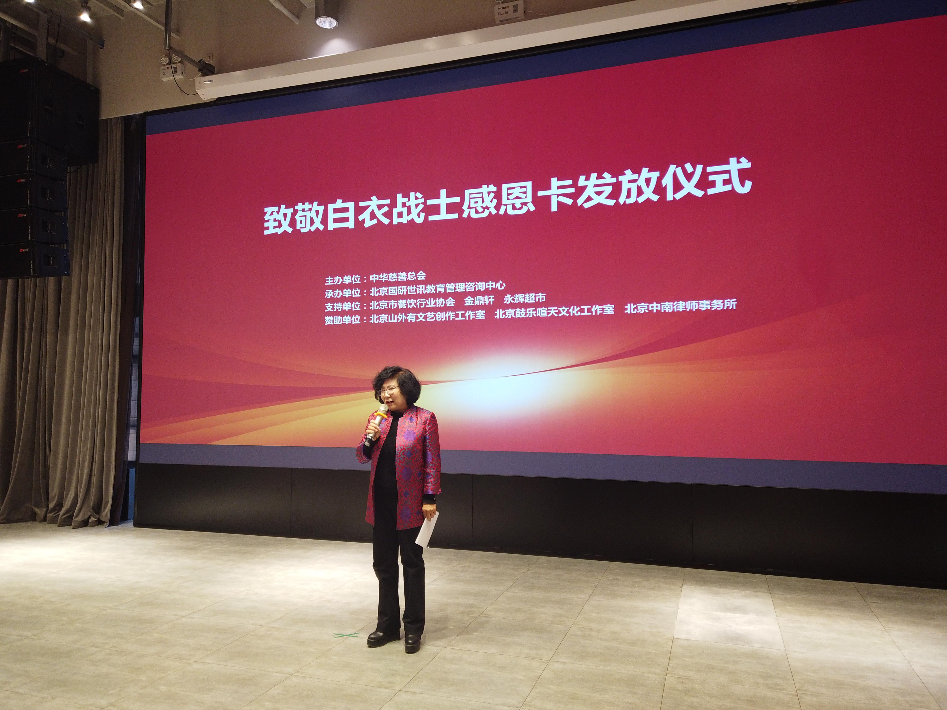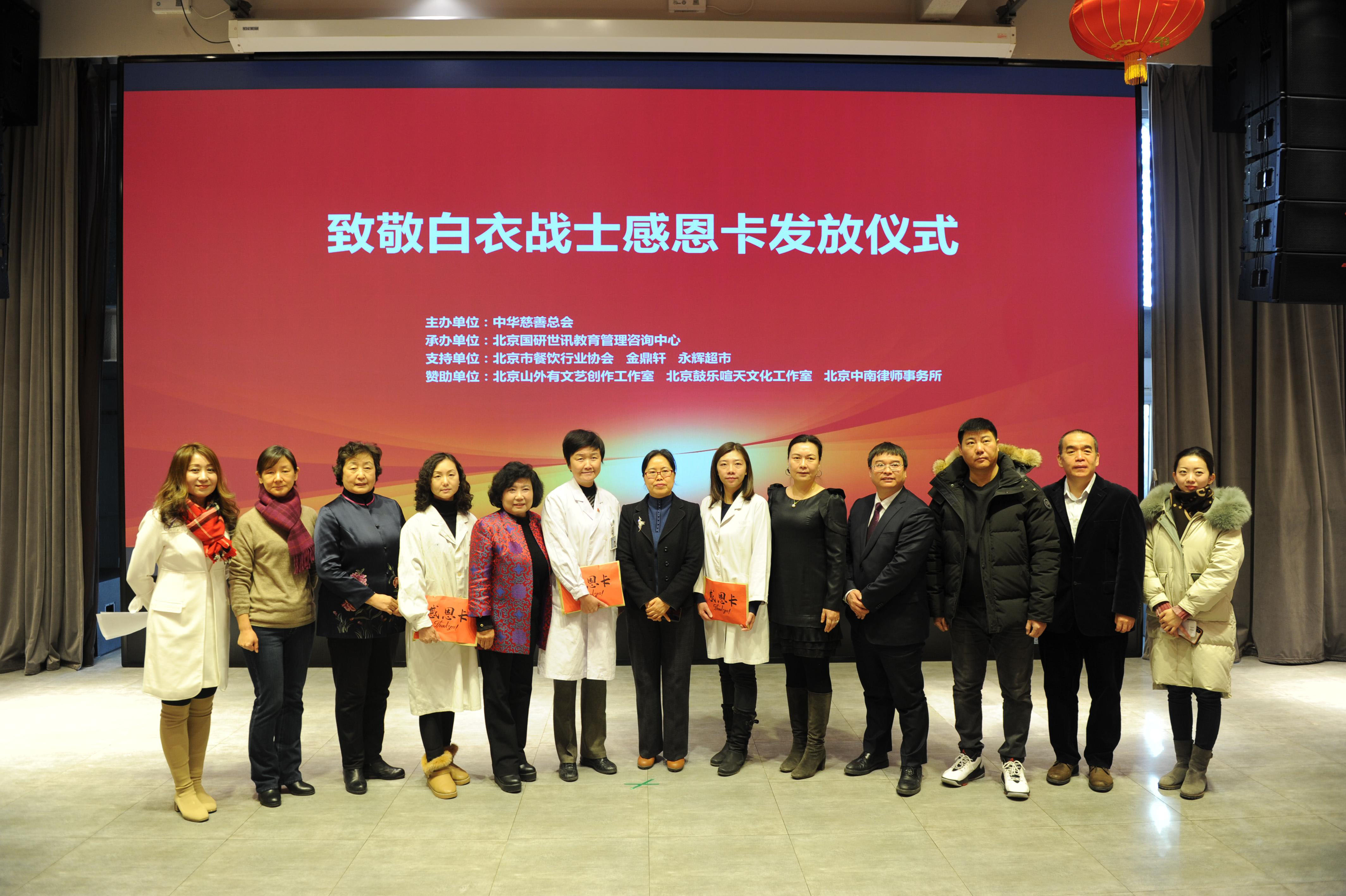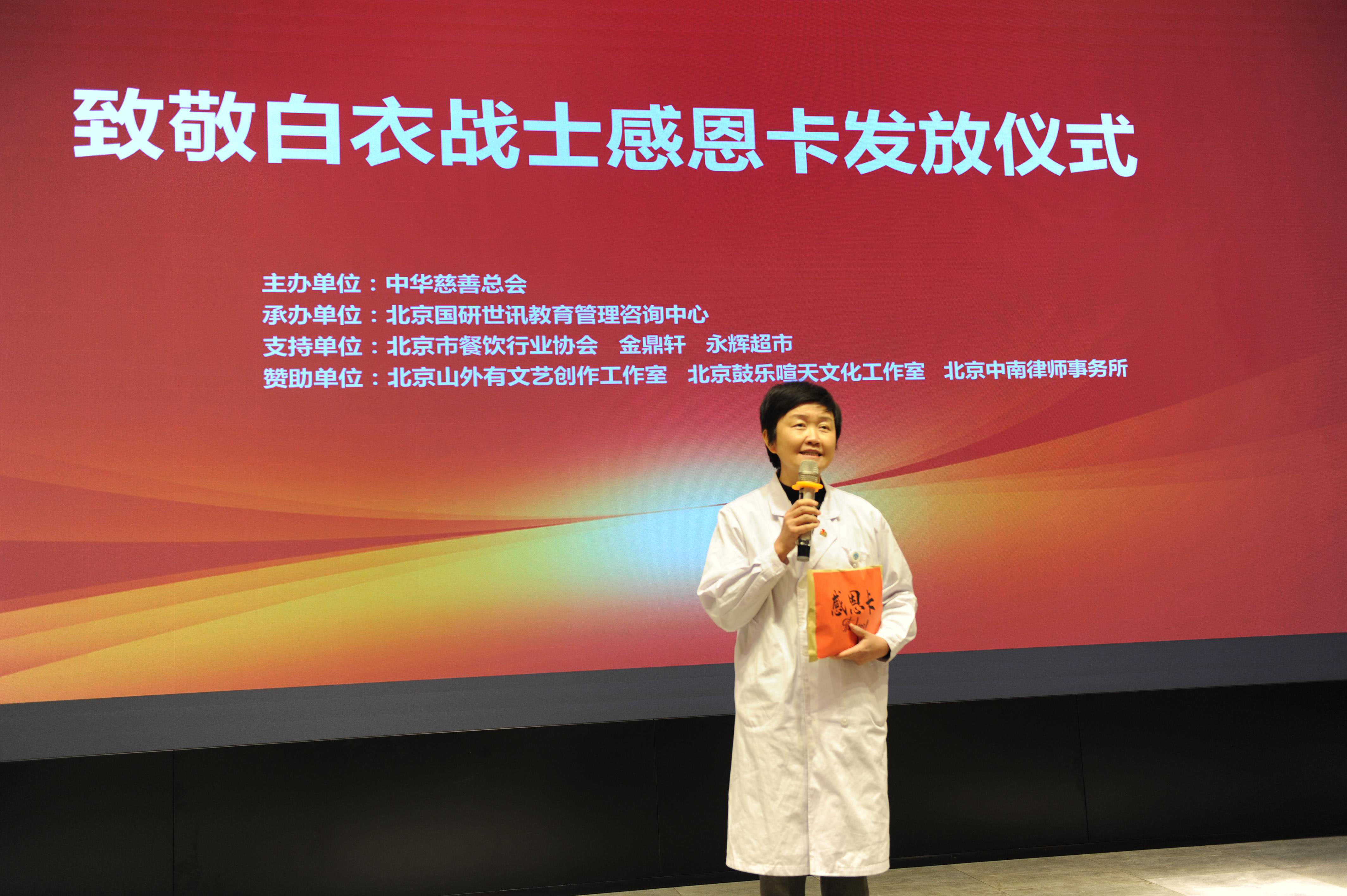 “致敬白衣战士感恩卡”发放仪式在京举行人民政协网北京12月30日电 日前,“致敬白衣战士感恩卡”发放仪式在金鼎轩亚运村店多功能厅举行。中华慈善总会副秘书长高守华、中华慈善总会“致敬白衣战士专项基金”负责人张惠英、捐赠方代表北京中南律师事务所主任陈卫平向新冠疫情防控工作中的北京医务工作者代表发放价值380500元的感恩卡共计460张,感谢他们为抗击疫情做出的突出贡献,并向他们致以崇高敬意。