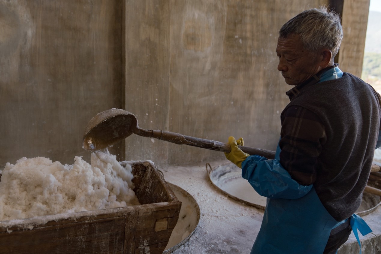 ▲诺邓盛产无碘钾盐。近两千年历史的盐井是大自然的馈赠,盐与腿的完美结合,产生绝佳的风味,让诺邓火腿因《舌尖上的中国》而名扬四海。图为诺邓火腿省级非物质文化遗产传承人李天嗣亲自熬盐,为腌制火腿做准备。(摄影:穆功)