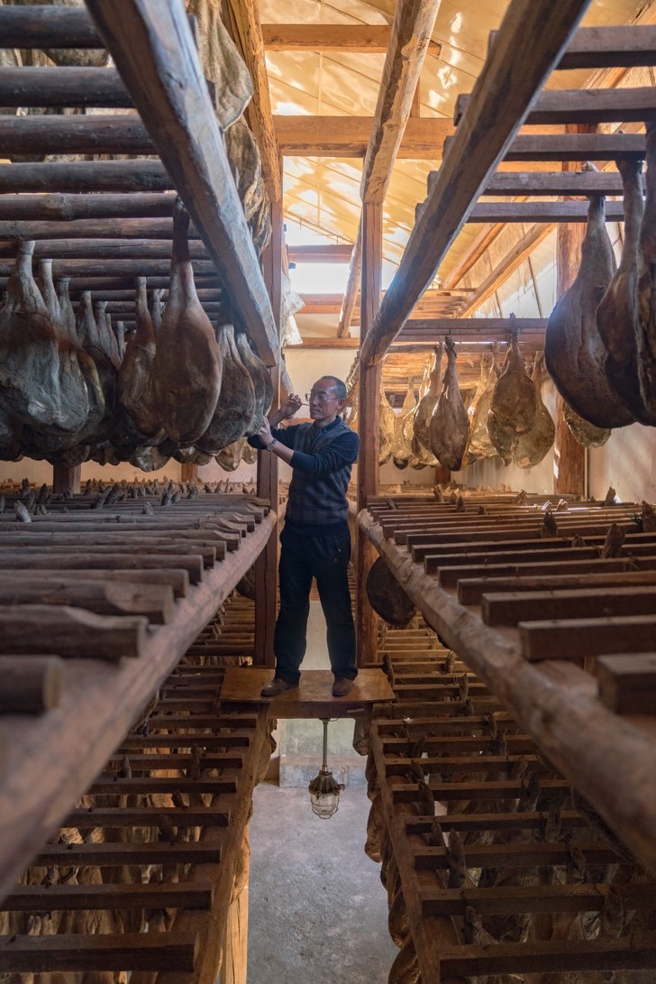 ▲目前诺邓火腿依然依靠传统手艺腌制晾晒,经过三年的腌制发酵才能形成一条好的火腿。徐琨斌每天的工作中,有很大一部分时间要花在晾晒火腿的管理上。(摄影:穆功)