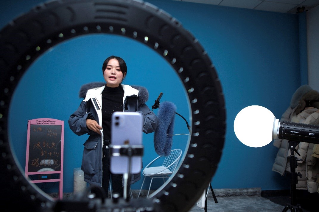 ▲年轻的小妹正在拼多多店铺做主播,她身上这款羽绒服是爆款,今年卖了5万多件。 (顾映雪 摄)