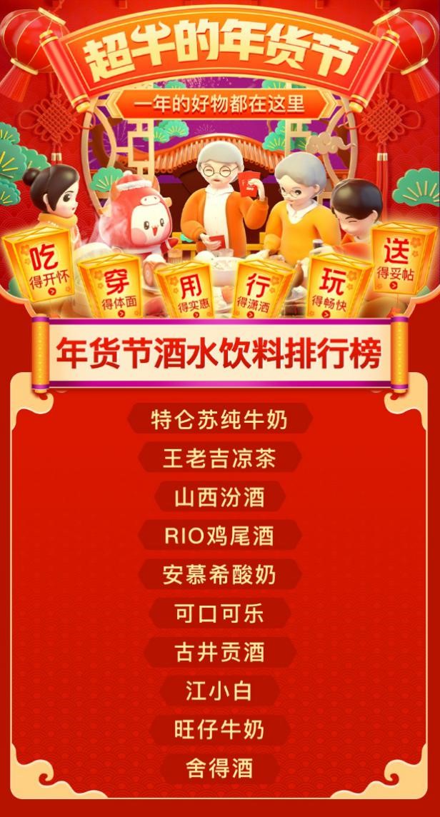 ▲拼多多“年货节”酒水饮料排行榜,奶类销量涨幅131%。