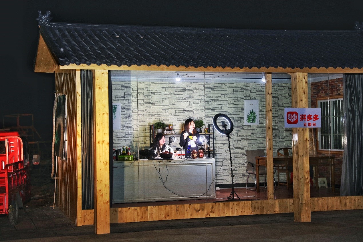 ▲傍晚时分,张小轲团队的工作人员在室外搭建的摄影棚里开启直播,推介外婆菜、瓦罐腐乳等农特产品。(安舜 摄)
